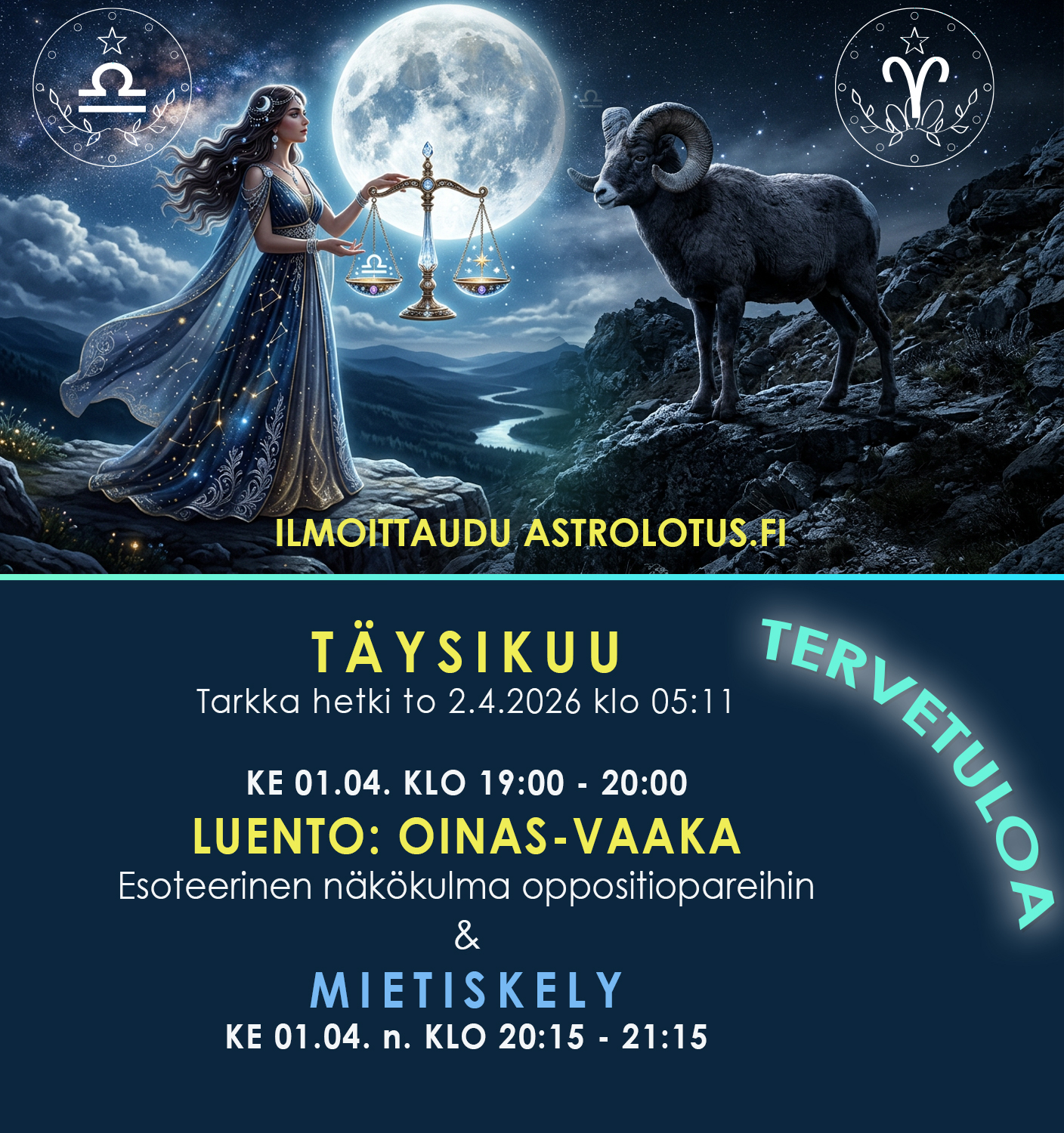 TÄYSIKUU OINAS-VAAKA -AKSELILLATarkka hetki to 2.4.2026 klo 05:11 Kuu Vaa'assaKE 01.04. KLO 19:00 - 20:00 LUENTO